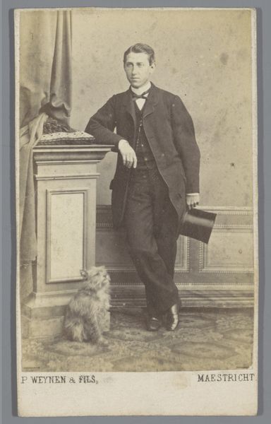 Editor: So, this gelatin silver print, titled "Portrait of an Unknown Man with a Dog," was taken sometime between 1875 and 1899 by Fritz Hüsig. The subject's stern expression and formal attire create an aura of respectability and a hint of melancholy, what catches your attention in this photograph? Curator: The composition immediately evokes the burgeoning bourgeois values of the late 19th century. Notice the deliberate arrangement - the backdrop suggesting grandeur, the presence of the dog as a symbol of loyalty, and the man's measured stance. All contribute to a narrative the sitter wishes to convey. How does this orchestrated scene resonate with you? Editor: I guess it feels performative, as if they're staging a certain ideal. Curator: Precisely! Think about how portraiture, especially photography, became accessible to a wider middle class during this era. This image is about asserting status, but perhaps also about grappling with anxieties around identity in a rapidly changing world. The dog, though, what does the symbolic weight of that animal suggest to you within that context? Editor: I see it as a signifier of loyalty, perhaps suggesting stability in this changing era? Also as a companion? Curator: That reading aligns well, offering both steadfastness and comfort, against anxieties of modernization, all interwoven in this tableau of middle-class aspirations and cultural anxieties. It also says that he can afford keeping and feeding an animal just for company. Editor: It is fascinating how much we can unpack from this seemingly simple photograph! I never thought about all those layers before. Curator: Indeed. Everyday images often hold the deepest cultural memory.