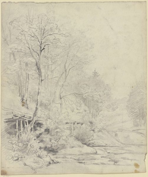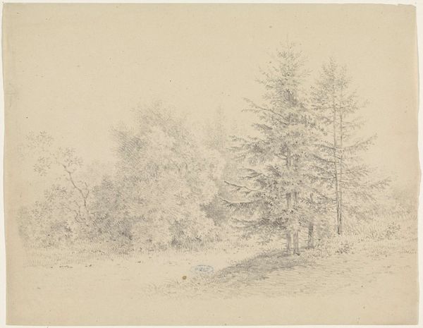 "Waldpartie bei Schlehdorf am Kochelsee" is a pencil drawing by Carl Morgenstern, who lived from 1811 to 1893. During that time, landscape art was heavily influenced by Romanticism, which prized nature as a source of spiritual or emotional experience. In this quiet forest scene, Morgenstern isn't just showing us a stand of trees; he's inviting us to contemplate nature's serene power. It's interesting to consider how landscape art like this often leaves out the human presence, even though our relationship with the land is always mediated by culture, labor, and even exploitation. What does it mean to depict nature as separate from human activity, especially in a time when industrialization was rapidly changing the landscape? The lone tree takes center stage, maybe symbolizing resilience or solitude. Morgenstern captures the tree's texture and form with delicate precision. The drawing offers a quiet moment of reflection that gently reminds us to consider our own place within the natural world.