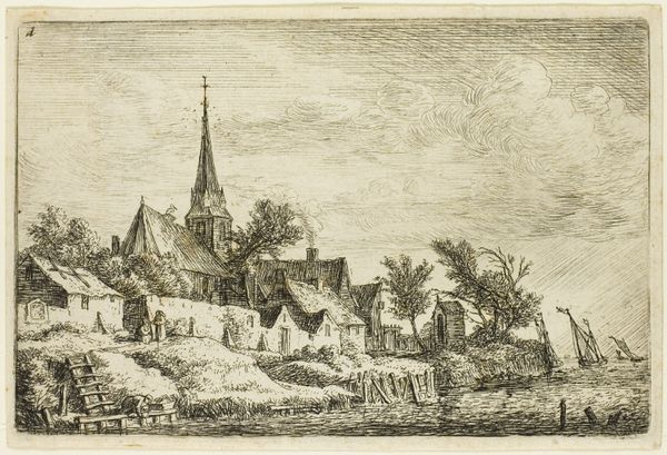 Curator: I find myself drawn to the serene depiction of Dutch life in this etching. Paulus van Liender created this cityscape around 1760; it is entitled "Gezicht op het weeshuis en blekerij bij Amersfoort." Editor: The sky certainly dominates the composition. Despite being a print, there's a surprisingly luminous quality. It almost feels peaceful. A romantic snapshot, in a way. Curator: The orphanage itself stands somewhat removed from the foreground action. There is a city wall with figures that serve as witnesses overlooking it. Notice the contrast between the dark tower of the city wall and the sunlit bleaching fields. Van Liender is creating a visual and symbolic separation, isn’t he? Editor: Definitely. Those fields…that's where the linen was spread out to bleach in the sun, I presume? What’s interesting to me is that the tower, a symbol of power, is aging, cracked. While the orphanage is neat, pristine… and busy with labor. It's as if he is emphasizing where labor happens, at least. Curator: Indeed, these bleaching fields were central to the Dutch economy. It adds to my thought that Van Liender’s positioning invites us to reflect on societal order. Who is outside, who is inside. How wealth is created and how it interacts with public welfare institutions. I imagine these institutions were also sources of control and places of cultural conditioning. Editor: It makes one consider the relationship between those in power, the city's economy, and the care—and control—of the vulnerable. A visual representation of the era’s social structure, with all its intricacies. What resonates across time here? The way urban environments and societal functions always blend, and how they tell the silent story about care and economic practices? Curator: For me, I see a potent visual echo of societal priorities and control mechanisms, reminding us that these themes are as resonant today as they were in 1760. Editor: Agreed. It underscores how art can offer an unspoken commentary on how cities function as lived spaces.