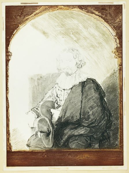 Editor: This etching, "Portrait of a Man in an Arm Chair," is attributed to Christian Josi and possibly dates back to 1821. What strikes me is the subject’s gaze – he seems to be looking directly at us. What do you see in this piece, considering its historical context? Curator: The gaze is certainly important. What I find compelling is the tension between its apparent directness and the role prints played in disseminating and, in a way, democratizing portraiture. Prints like these enabled a wider audience to engage with images of people, albeit usually still people of some status. This work, part of a collection imitating Dutch and Flemish masters, suggests a conscious engagement with artistic lineage. Editor: So, it’s not just about the man himself, but also about how the image circulates and what it represents in a broader cultural sense? Curator: Precisely. Consider the setting. The arch frames the subject, lending a sense of importance, almost like a stage. How does this stagecraft influence our understanding of the sitter’s status or the portrait’s intended audience? Is he performing for us or for posterity? Editor: That makes me think about how collections like these influenced art education and the public’s perception of “great masters." They shaped taste, right? Curator: Exactly! Print collections were powerful tools for establishing and reinforcing canons of artistic excellence, thereby shaping what was deemed valuable in art. To understand the image fully, we need to understand its life within collections like Josi’s and how such collections participated in the broader politics of taste. Editor: This was much more complex than I initially thought, it's not just a portrait of someone. Curator: Indeed. Art exists within networks of social, cultural, and institutional forces, not in a vacuum. Editor: This helps appreciate how reproductions create ideas, establishing the prestige of earlier images in a period with ever more availability of imagery.