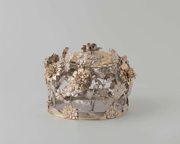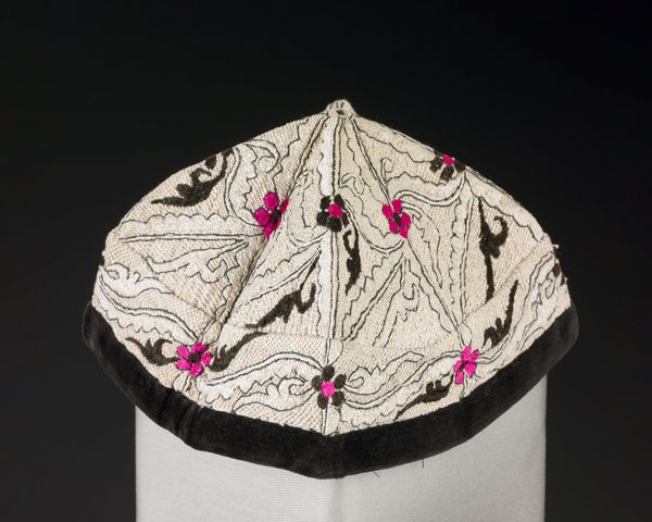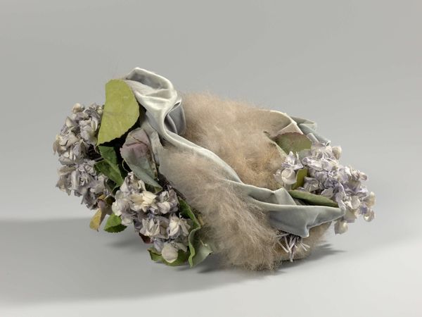 Editor: This is "Hat with Roses," created around 1902 by A. Jacot. It appears to be made primarily of textiles, and what strikes me first is how the roses contrast with the metallic texture on top. It’s such an interesting mix of delicate and almost industrial elements. What stands out to you? Curator: What I find captivating is considering the means of its production and the context of its consumption. Let’s think about the labor involved in creating this piece. From the cultivation of materials like silk or cotton, to the craftsperson's meticulous arrangement of the roses and metallic threads. Each element, however 'delicate,' relied on an expansive global network of laborers. Editor: That makes sense. So, you’re suggesting it’s less about simple beauty and more about…the system that enabled its existence? Curator: Precisely. Think of the materials themselves—where did these textiles come from? What were the working conditions of the people who harvested, spun, and dyed them? This hat is a testament to both artistic skill and the complex, often obscured, economic realities of the Art Nouveau era. Is it an object of adornment or an index of exploitative systems? Or, can it be both? Editor: I see your point. Looking at it now, I'm thinking about all the unseen hands that contributed to its creation. Thanks, that definitely gives me a lot to consider! Curator: Absolutely. It invites us to rethink how we value art and the material world surrounding us. Perhaps true luxury is awareness of these origins.