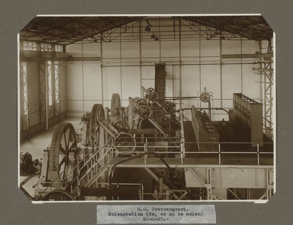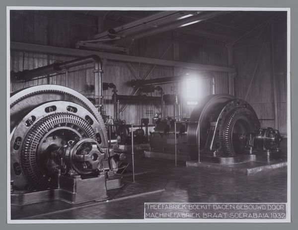This photograph shows gas machines that were built in 1932 for the Boekit Daoen tea factory by Machinefabriek Braat Soerabaia. The image encapsulates industrial progress and colonial economies in the Dutch East Indies, now Indonesia, during the early 20th century. The photograph is a window into the economic structure of the time, where resources were extracted and processed in colonized lands. The tea factory and its gas-powered machinery represent the exploitation of resources that fueled capitalist expansion. To understand the image further, we would need to research the Machinefabriek Braat Soerabaia, the Boekit Daoen tea factory, and Dutch colonial policies in the East Indies. The image serves as a potent reminder of the entanglement of industry, colonialism, and power. Such study will reveal the complex social conditions that shaped the production of both the machines and the photograph itself.