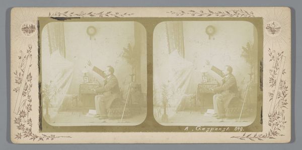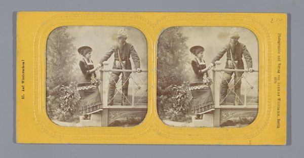 Editor: So this is "Mensen in klederdracht in bergdorp," or "People in traditional costume in a mountain village," dating from somewhere between 1855 and 1875, by an anonymous artist. It looks like a photograph, a gelatin silver print. I'm struck by the very staged feel. It's like a scene from a play. What jumps out at you when you look at this? Curator: Oh, this takes me back! I remember finding similar stereoscopic images tucked away in my grandmother's attic. They're like little time capsules. For me, beyond the staged quality – and you’re spot-on, it's pure Romantic era posing – I’m drawn to the *story* it tries to tell. What narrative are these costumed characters enacting? Are they celebrating, or simply presenting an idealized vision of rural life? Editor: That's interesting. I didn't think about the story aspect so much. So, it's more than just a pretty picture; it's trying to communicate something about this time, this culture? Curator: Precisely! Think of it as a visual postcard. It offers a glimpse – perhaps a highly embellished one – into a world that was already rapidly changing. This piece is from the time when photography started becoming democratized. It allows us to observe both reality, as much as they can catch it, and what the artist thought should be valued in this particular setting. What do you reckon someone at the time would make of it? Editor: I guess they’d be drawn in by that romantic view of their local area! It’s almost like looking at a filtered Instagram post today. Curator: A wonderful analogy. It reminds me of how much we crave and create these romanticized representations of everyday existence, no matter the medium. Even when, at times, they might need to be taken with a heavy dose of salt. Editor: That’s a great point, I'll definitely be looking at photographs differently from now on.