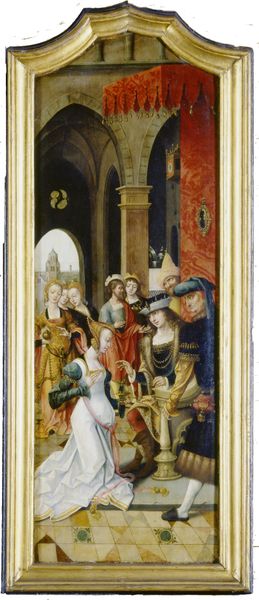 This is “King Solomon Receiving the Queen of Sheba” by an artist known as the Antwerp Mannerist. The painting is a cascade of vertically stacked figures, architectural details, and ornamental flourishes. Rich colors, intricate patterns and varied textures define the scene, which evokes an overwhelming sense of opulence. The composition, almost claustrophobic in its density, rejects classical balance. Instead, it emphasizes a decorative layering that was characteristic of the Mannerist style. Each element, from the checkered floor to the distant cityscape, is rendered with equal attention to detail, creating a surface that is visually stimulating. The artist seems less concerned with naturalistic representation and more interested in creating a stage for the display of wealth and power. The very act of layering and decorating challenges the classical ideas of harmony, offering us an insight into a world where excess is not a vice but a virtue. This painting is less about historical narrative and more about the spectacle of display.