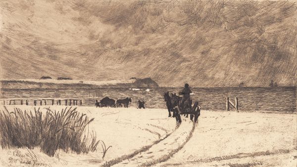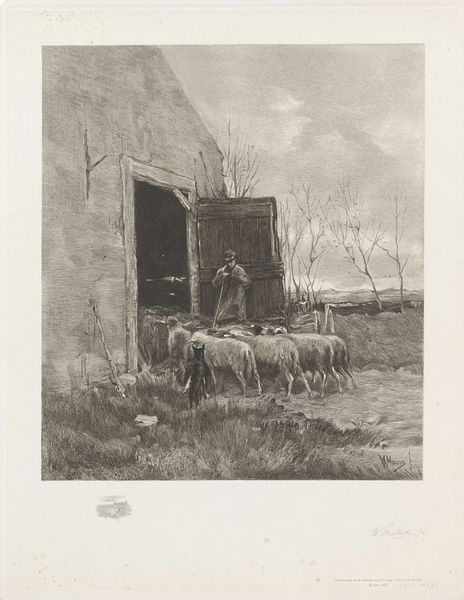 Editor: Here we have "Fåreflok foran en jordhule med folk" by Hans Smidth, created sometime between 1854 and 1917. It’s a painting, predominantly in monochrome, depicting a sheep flock in a landscape setting. The whole image feels stark and quite... humble, even a little bleak. What jumps out to you about this piece? Curator: Immediately, I'm drawn to the construction of the earth dwelling. Note how the materials—presumably locally sourced earth and perhaps some timber—blend seamlessly into the surrounding landscape. It begs the question, what does this integration of the built environment and nature tell us about the relationship between these people and their labor? Editor: That’s a good point. It does feel very much like the dwelling is part of the landscape, not imposed upon it. So, you’re seeing a direct reflection of the social context in the building materials? Curator: Precisely. The artist highlights the raw materials and the practical construction, drawing attention to the labour inherent in creating even basic shelter. Consider also the division of labour evident. There’s tending to the flock, the implicit work of maintaining the structure, perhaps even textile production suggested by the sheep themselves. How do these details contribute to your sense of “bleakness”? Editor: I think it’s that the lack of color, combined with what you point out – the focus on labor and the basic materials – strips away any romanticism. It feels very matter-of-fact, emphasizing the harshness perhaps. Curator: Yes. This isn't a picturesque view of rural life, is it? The painting implicates the viewer in the cycle of production and consumption, nudging us to consider the often-overlooked realities behind everyday resources. It questions our preconceptions of art by merging 'high' art, painting, with observations about agrarian materiality. Editor: That definitely reframes how I see it. Instead of just bleak, it's more... grounded, conscious of its own construction and what it represents. Thanks for that! Curator: Indeed, understanding art through its materials and modes of production opens up entirely new avenues of interpretation. It challenges us to look beyond aesthetic appeal and see art as a product and a record of human endeavor.