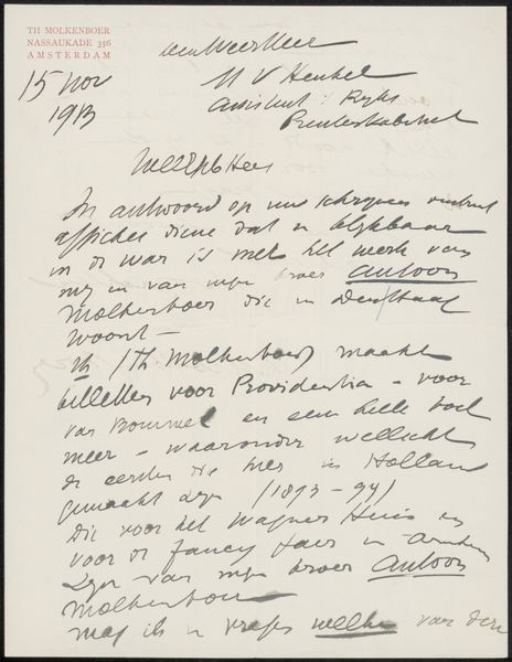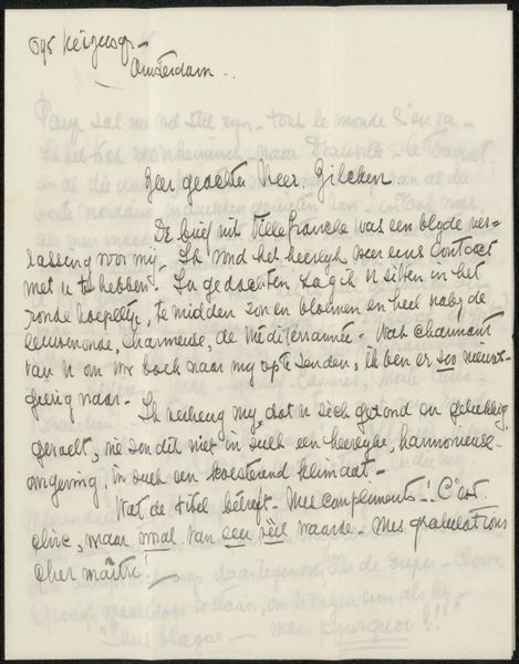 This letter to Philip Zilcken was written by Maurice Maeterlinck on December 6, 1921, using ink on paper. The blue ink is applied with a delicate hand, each word carefully rendered, but the handwriting is informal and a bit messy. See how certain letters trail off, as if the writer's thoughts were outpacing his pen. The blue ink against the off-white paper feels intimate, like a peek into a private exchange. Look closely and you can see the texture of the paper and the slight variations in the ink's tone, where it's denser in some areas and lighter in others, giving the script a tactile quality. The overall effect is that of a moment frozen in time. I’m reminded of Cy Twombly, although Maeterlinck’s marks are less overtly expressive, there's a similar sense of immediacy. Both seem to value the process and the intimacy of the handwritten, creating a space where the personal and the aesthetic merge.