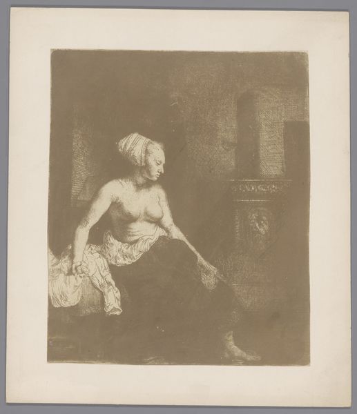 Curator: This etching by Rembrandt van Rijn, made around 1658, is titled "Woman Sitting Half-Dressed beside a Stove." It resides here at the Metropolitan Museum of Art. Editor: There's a subdued intensity to the composition. The stark contrast and rough hatching give it a very somber, almost anxious feel. Curator: Yes, look closely at how Rembrandt masterfully uses shadow and light. Notice the geometric rendering of the background elements: a hearth, a chair, all receding from a light that graces the sitter's profile. There is almost a study in how light both reveals and conceals form. Editor: The image troubles me. Given its date, it's almost certain this depiction is from a male gaze. A woman presented, partially clothed and caught within the domestic space. One can't ignore the power dynamics at play here. It could be a social commentary on the everyday vulnerability experienced by women of that era, exposed to exploitation by those in power, though it lacks explicit context, there’s just the hint of everyday vulnerability. Curator: Undoubtedly, an interpretive layer. Yet I find the formal language quite fascinating in its own right: it is the dynamism of the line and stark interplay of dark and light values which creates a visually compelling form—quite aside from whatever message you attribute. Editor: But form does not exist in a vacuum, does it? It always arises within, and refers back to, social contexts. We cannot just unsee our understanding that the history of art is unfortunately entangled with representations like these, often made from inequitable power dynamics. Even in admiring Rembrandt’s use of light, we must acknowledge the historical circumstances from which it emerges, which may or may not critique, but at least references those same conditions. Curator: I agree that context is crucial, yet I find the stark light more as something transcending these earthly interpretations; it points towards an elegance beyond a straightforward patriarchal lens. We shall not, and perhaps cannot, reach full interpretive resolution, alas. Editor: And isn't it within those tensions, within those unresolvable ambiguities, that the etching gains meaning? Curator: Indeed, perhaps that’s where its enduring resonance is discovered. Thank you. Editor: A pleasure.