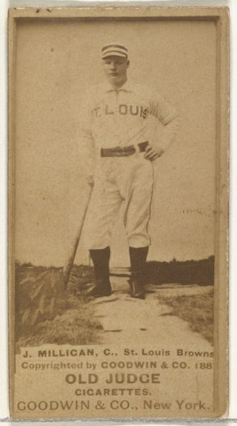 This is a promotional baseball card from 1887, produced by Goodwin & Company for Old Judge Cigarettes, featuring Nathaniel P. "Nat" Hudson, a pitcher for the St. Louis Browns. Nat Hudson stands poised, his arm extended in mid-throw, an echo of classical depictions of athletes and heroes. Consider the gesture of the outstretched arm, a symbol that transcends mere athletic action. Think of the Roman emperors depicted addressing their legions, or even religious figures offering blessings. This gesture, laden with authority and power, appears here repurposed, democratized. It is no longer the divine right of kings, but the athletic prowess of a baseball pitcher. This card speaks to a shift in cultural values, where the hero is not a monarch or a god, but an athlete, a symbol of American enterprise and vigor. We are drawn to these images, not merely for their aesthetic value, but because they tap into something deeper—a collective memory of symbols and gestures that resonate across time. The image, innocuous as it seems, thus becomes a potent cultural artifact, revealing the complex ways in which we construct and celebrate our heroes.