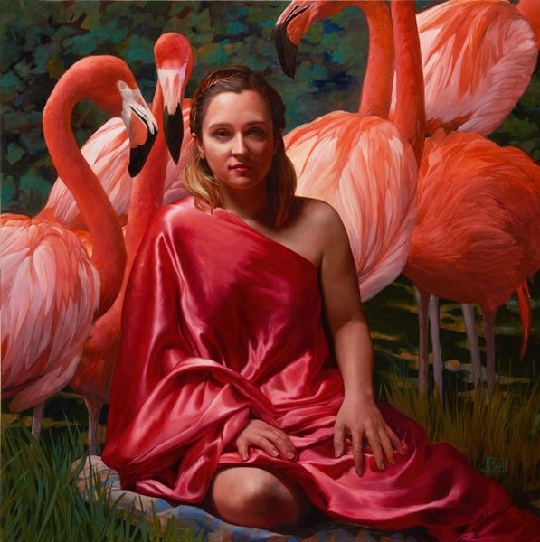 Julie Bell painted "Flamingos" in her signature style, one that's characterized by vibrant color and meticulous detail. The composition is immediately striking; two flamingos are nestled closely together. Notice how Bell uses a limited, yet intense, palette of reds and oranges, setting the subjects against a backdrop of verdant greens and murky browns. Bell's method of blending realism with elements of fantasy introduces a semiotic language that extends beyond pure representation. Her work can be interpreted as a signifier that engages with themes of natural beauty, transformation, and the idealization of form. Through a formal lens, "Flamingos" doesn’t simply depict birds. Instead, it deconstructs the way we perceive form and meaning. The painting serves as an assertion of art's ability to transcend conventional categories, inviting an ongoing dialogue about beauty and representation.
