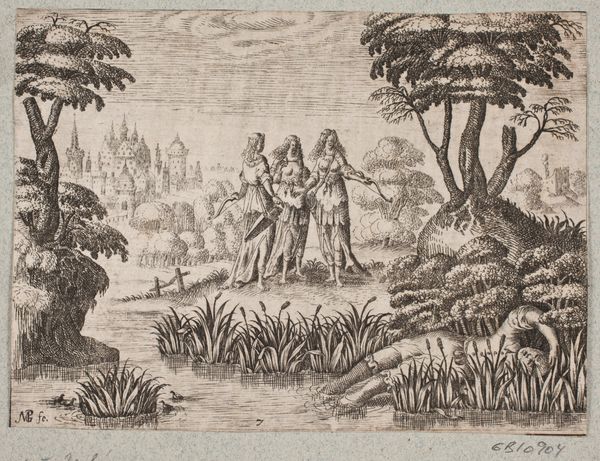 This etching, "Minerva bij akker die bewerkt wordt door putti," was created by Abraham Delfos sometime before his death in 1820. The composition is immediately striking, dominated by a contrast between the static figure of Minerva on the left and the active putti populating a field on the right. The stark lines of the etching define the figures. The putti, engaged in agricultural labor, are rendered with a lightness that belies their labor. Minerva, however, is shaded by a thick cloud, heavily armed, and oversees the scene from above, her figure a study in power. This dynamic arrangement establishes a visual hierarchy that leads us to question the role of labor, and authority. Is this about guidance or governance? Does the weight of Minerva's presence contrast with the lightness of the putti to suggest a world in balance or a world under watch? Ultimately, it is the interplay between form and symbol that invites ongoing reflection.