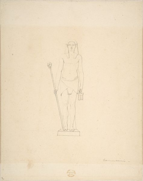 Curator: Here we have Vincenzo Camuccini's "Kneeling Gladiator," a pencil drawing, possibly also an etching, completed sometime between 1771 and 1844. Editor: There's a remarkable delicacy to it. The linework is so faint, almost tentative, yet it conveys this sense of latent power. Curator: Indeed. Camuccini's mastery of line and form is evident, characteristic of the Neoclassical pursuit of ideal beauty and the precise rendering of the human form. Note the figure's contrapposto, the play of tension and relaxation in the pose. Editor: What interests me is less the ideal and more the reality, or perhaps the attempt to mask a violent process behind an aesthetic ideal. The meticulous draftsmanship strikes me as being in dialogue with the realities of the work and its social implications during this historical moment, and specifically of this subject in gladiator combat. Who was profiting off of the labour in service of a bloody, inhumane spectacle? Curator: It is hard to overlook those implications, I agree. The controlled and refined style—that emphasis on line, the idealized musculature, even the subdued tonality of the pencil—speak to Neoclassicism’s aspiration toward order and reason, contrasting with, even perhaps containing, the raw brutality that underpinned gladiatorial contests. Think of the philosophical framework artists like Camuccini inhabited; the classical ideals served to communicate moral virtue. Editor: Yet, can the artist ever really sanitize this figure from the grim, and gritty elements from which this figure stems, or should that not be our priority anyway when viewing art. Pencil as the core material has been used for much of history. Who had access to that pencil and what choices did Camuccini have available? Those kinds of questions ground it for me in its production and reception in a way that emphasizes art's inextricable links to material culture and power structures. Curator: A crucial connection. By focusing on the form, we appreciate the aesthetic dialogue within Neoclassicism; whereas by addressing the material context, you reveal the broader social and ethical complexities within that apparent formality. Editor: Precisely. We expose not just the ideal, but the ideology. I suppose it encourages me to ask, is it ever truly possible to strip art of any connection to labour or society? The image remains suspended between aestheticism and history, between idealization and reality.