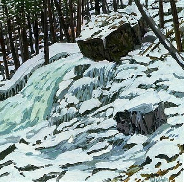 Curator: Nicholas Roerich's 1912 oil painting, "Solveig's Song (Hut in the Forest)," presents a winter scene with a small cabin nestled amongst trees and snowy hills. Editor: My first thought? Eerily beautiful. It’s as if the whole scene is holding its breath. Those towering trees cast such long shadows on that poor little hut, it feels exposed and vulnerable, almost fragile. Curator: Right, and it's interesting to consider Roerich's position during its creation. Russia at this time was in a pre-revolutionary state; in art, movements like Symbolism and early abstraction flourished and he became deeply involved with the World of Art movement, concerned with questions of national identity and the spiritual in art. The use of simplified forms, strong colors and defined outlines in painting such winter scenes was part of this investigation of indigenous visual language. Editor: I see it more as an expression of deep solitude. The cool palette amplifies that. Yet, I keep being drawn to the materials used – oil paint gives an interesting contrast of flat and glossy sections with texture that brings me to the bark on trees and roughness of that tiny little home. I can almost smell the woodsmoke struggling against the vast silence. Curator: Consider also that Roerich was designing sets for theatre productions such as Ibsen’s ‘Peer Gynt’ around the same period. "Solveig's Song" seems a perfect distillation of the emotional landscapes and mythical longings these productions invoked. We're looking, essentially, at stage design without the stage; it makes visible a yearning that cannot quite materialise. Editor: And to think this quiet canvas springs from theatrical ambition! Looking at it through that lens helps me to perceive the small human gesture represented by the hut as a beacon in a barren landscape, somehow suggesting hope or survival against impossible odds. Did Roerich work on it 'en plein air'? I imagine the wind biting, painting freezing. Curator: Possibly from earlier studies, although much of Roerich's Russian landscapes from this period combine careful observation and formal experiment in the studio. The painting operates on different registers; we read the cabin in the woods on a formal, technical, even historical level, and we're then invited to consider the emotionality you describe: hope, the struggle, our loneliness in face of the monumental and eternal. Editor: Looking again, what strikes me is how relevant this still feels today. So simple, yet laden with anxieties. Maybe Roerich managed to distil something genuinely essential about the human condition and place within the broader, indifferent scheme of things. Thank you; I understand more because of our conversation. Curator: Indeed; looking again it certainly bears consideration. Thank you too.