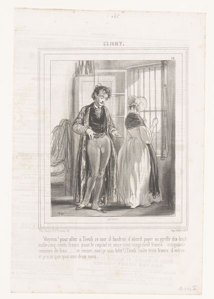 Curator: Allow me to introduce you to Paul Gavarni’s lithograph, “Man Kisses the Hand of an Actress,” created in 1843. Editor: Ah, the 19th century! It has that wonderfully stilted, yet theatrical feel to it, like a play caught in mid-performance. All the exaggerated movements feel as if they are screaming. Curator: Precisely. Notice the delicate use of line. It’s quite characteristic of his style. It uses meticulous detail, with many crosshatched lines, for dramatic visual texture. Editor: It looks almost frantic, that crosshatching. It’s not merely decorative; the texture gives an urgent feel, like the moment is about to evaporate. Tell me about that contrast, where deep, dark shadows dominate. It's not very common. Curator: Well, that would highlight Gavarni's genius. The formal contrasts he creates in lithograph add to the overall mood. He focuses on that period’s theme of social satire through images like these. Editor: It really brings home that Romantic obsession with emotion, albeit presented in such a formal, restrained style. What do you think about the space—this almost blank stage they occupy? Curator: I read that as a reflection on the actress's fleeting moments of glory. This, for example, contrasts against the very temporary nature of fame in that time. What looks frozen will become nothing. That empty stage suggests the ephemeral nature of performance itself. Editor: True. She seems slightly sad but also triumphant, to have this kind of affection and devotion on display in the first place. Curator: This really strikes me with the universal search for acknowledgment—something both men and women seek but obtain only briefly in that moment captured by Gavarni’s wonderful period sensibility. Editor: You know, looking closely, this is quite fascinating how those moments still resonate today. The search, the yearning and melancholy. Gavarni truly created an interesting work.