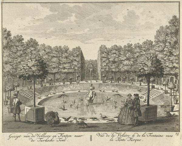 Curator: This is "L'Isle Royalle," a print by Jean-Baptiste Rigaud. The image presents a formal garden, quite possibly near a palace, populated with figures in period dress enjoying the space. Editor: It has such a staged, almost theatrical quality. Everyone is carefully arranged, like players on a set. The sharp lines and details, it’s all quite striking. Curator: The artist employs an old engraving style. It gives the work a crisp precision, almost like a technical drawing. The fine lines and intricate detail remind one of botanical illustrations or architectural plans from the same era. Editor: Precisely! It lends a certain weight and formality, doesn't it? It’s as if the artist is cataloging not just a place, but a particular social order, a very structured way of engaging with nature. The lines all serve a narrative. Curator: I agree. Notice the meticulous depiction of the figures and their clothing. Every fold, every button is carefully rendered, speaking volumes about status, hierarchy, and the politics of appearance. There's an interesting dance between nature and culture being depicted. Editor: I see the psychological undercurrent too. It seems like this organized space imposes its own type of control onto those who inhabit it. Do you see any reflection of that tension or confinement as part of court life? Curator: I'm inclined to agree. While ostensibly a scene of leisure, "L'Isle Royalle" conveys the constraints of its era and the very public performance of private life at court. The work really encourages a close look, both technically and sociologically. Editor: It offers us a glimpse, really, into the aesthetics of power and its display, not just the literal arrangement of garden and fountains, but how this visual grammar impacts how the elites thought of themselves. Curator: Indeed. Considering it altogether, "L'Isle Royalle" is not merely a pretty picture of the past but a potent symbol of its structures. Editor: Precisely, structures that reveal something that still persists. The arrangement is not only historical; it’s archetypal.