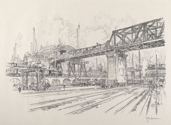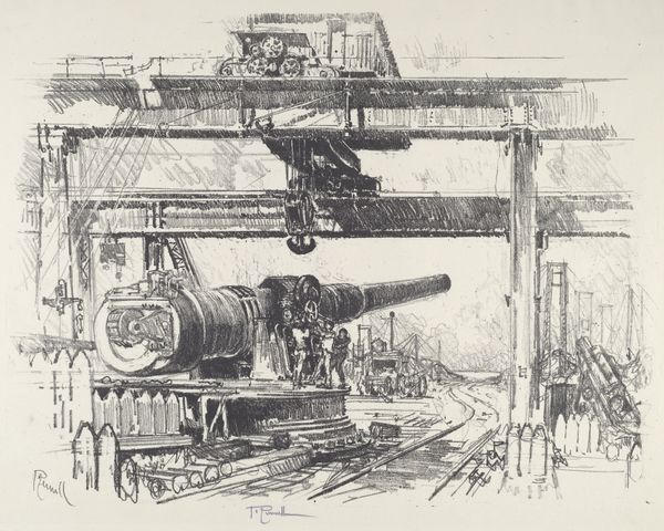 Joseph Pennell’s print captures the interior of a factory, filled with colossal machinery and workers dwarfed by their creations. The large shells being planed hint at their ultimate purpose: munitions for war. Notice the prominent overhead crane. This motif of mechanical assistance echoes earlier depictions of divine intervention. Think of classical gods lowered from the heavens to influence earthly events; now, the crane performs a similar function, a modern deus ex machina. This symbol, however, has transformed from a sign of hope to a symbol of industrial might. It represents a new era where technology shapes human destiny. Consider the emotional weight of this transformation. The cold, metallic geometry of the machines contrasts sharply with the human figures, suggesting a psychological tension between man and machine. This scene evokes a sense of awe mixed with anxiety, reflecting our collective, subconscious struggle to reconcile progress with its potential consequences. Pennell's print serves as a stark reminder of how symbols evolve, carrying echoes of the past while adapting to the anxieties of the present.