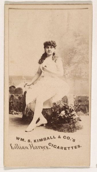 This small card, printed by W. Duke, Sons & Co., features the actress De Sartis, and was originally a promotional insert for Cameo Cigarettes. The card is a mass-produced object, printed on paper, and the image itself is a photograph reproduced through a printing process like lithography, allowing for inexpensive replication. The sepia tone gives the card an antique feel, a characteristic of early photographic printing. The decision to print a photo of an actress connects to a broader context of celebrity culture and the rise of mass media, where images of performers were circulated widely to promote products. It also speaks to the labor involved, from the photographer and printer to the actress herself, who is participating in the commodification of her image. The amount of work that goes into the image, the setting and her dress contrast to its function as advertisement, and the amount of labour that went into the mass production of the card itself. Considering the materials, processes, and its function, this card goes beyond mere commercial ephemera, revealing how deeply connected art, labor, and consumer culture were at the turn of the century.
