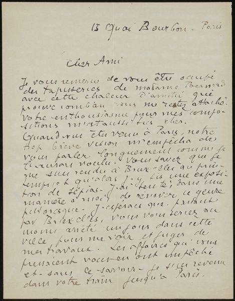 This handwritten letter to Philip Zilcken was created in 1908 by Cornelia van der Hart, a Dutch artist. The most immediate formal quality is its script, arranged in a compact, almost architectural structure, which gives the impression of a carefully constructed edifice. The ink's dark hue against the off-white paper creates a high-contrast visual experience. The density of the writing fills the page, allowing small margins, giving us an insight into the ideas that preoccupied Van der Hart. The act of writing itself becomes a form of self-portraiture, as the content relates to the author's thoughts on creating a biography. She engages with the idea of self-representation, considering how one’s life can be narrated and interpreted. The absence of a visual portrait is substituted by the intimate act of handwriting. The letter ultimately functions as a cultural artifact reflecting on the self and the process of artistic and personal representation. The materiality of the letter, from its paper to ink, serves as a powerful signifier, enriching our understanding of its cultural and philosophical significance.