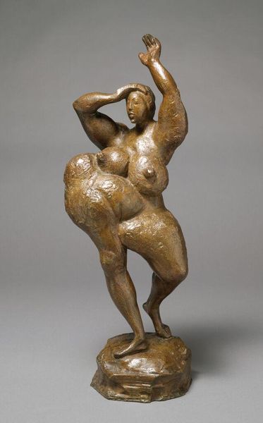 Curator: This is Gaston Lachaise's bronze sculpture "Woman (Hesitation)", currently residing here at the Harvard Art Museums. Editor: There’s something incredibly arresting about this figure; she feels both tentative and boldly present. Curator: Indeed. Lachaise often explored the female form, but what's striking here is the gesture. The outstretched arms, the lifted foot – they evoke a sense of anticipation, a readiness to embrace something new. Editor: It almost feels like a reclamation of space. For so long, the female body in art has been about passive observation, but here, she’s on the verge of movement, of agency. Curator: It begs the question: what is she hesitating about? And what potential does that hesitation hold? It resonates with the eternal human dance between fear and desire. Editor: Absolutely. This sculpture really makes me think about the historical constraints put on women’s bodies and their potential for freedom and self-expression. Curator: A beautiful interpretation. Lachaise's "Woman" continues to challenge and inspire across generations. Editor: It's a compelling reminder of the narratives embedded within our physical forms.