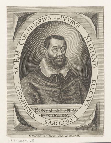 Curator: Welcome. Before us is Elias Widemann’s engraving, "Portret van Petar Petrečić", created around 1650. The work is currently held in the collection of the Rijksmuseum. Editor: Immediately, I notice the crispness of the lines. It's incredible what could be achieved with engraving back then. Look at the layering; you can almost feel the texture of his beard and the formality of his garments. Curator: Yes, Widemann's technical skill is evident. Petar Petrečić was, at the time, the Bishop of Zagreb, which accounts for the sartorial signs of power, even the framing ovoid. What intrigues me, however, is the inscription; can you see it? 'Iustus absq(ue) terrore erit'... 'He will be just without terror.' Editor: The symbolic language of leadership. Even through this single material artefact –the engraving– a social role and an ideology are solidified. Curator: Indeed. And in a way, it speaks to a larger concern that remains relevant: the nature of just leadership, of faith and governance. Note the gaze, quite direct. There's something timeless about it. I wonder how many impressions Widemann produced of this particular portrait. Editor: Considering the social and religious relevance of portraits like this, along with their material endurance through distribution, they become vital carriers of institutional messaging, effectively propagating its symbols far beyond Zagreb itself. And of course, there's the practical purpose of making the Bishop visually recognisable. Curator: The weight of symbolism conveyed through repeatable impressions—transforming social identities through widespread representation. It serves not just as a portrait, but also an act of asserting identity and authority within the community and in the eye of history. Editor: This artwork stands as a fascinating artifact –a testimony to the intertwined nature of power, representation, and material practice. Curator: A mirror, if you will, reflecting enduring questions about the nature of influence and leadership.