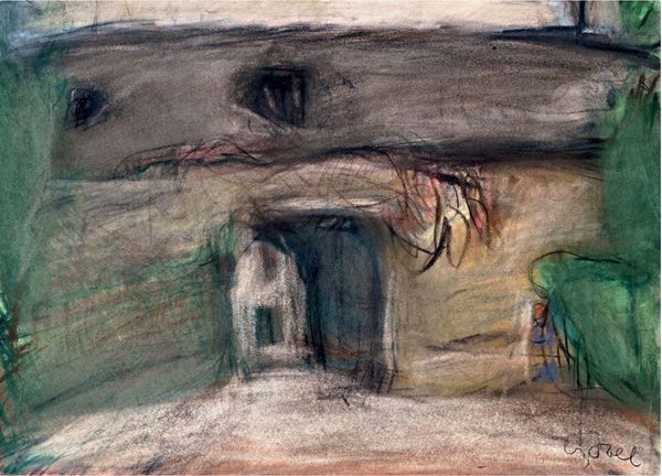 Béla Czóbel, a Hungarian artist who lived through both World Wars and several changes in political regime, made this landscape of Szentendre with watercolor and pencil. Czóbel was a member of the group of artists called "The Eight," who brought post-impressionist and expressionist painting to Hungary. Szentendre, a town north of Budapest on the Danube River, became a haven for artists in the early 20th century. Czóbel captures a fleeting moment, a landscape of rolling green hills and trees, overshadowed by the grayest of skies. The scene feels both grounded and ethereal, as if conjured from memory. The landscape is more than just a pretty picture. It reflects the longing for a simpler life, connected to nature, at a time when war and industrialization threatened to erase it. This artwork serves as a reminder of the importance of place, identity, and belonging, in a world that is constantly changing.