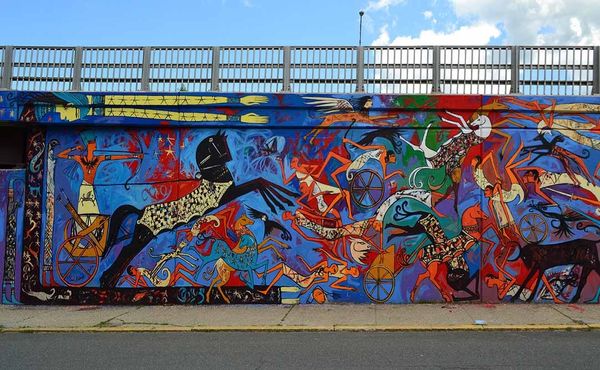 Speedy Graphito's mural in Parc des Bruyères, France, is a wild, colourful explosion, probably made with spray paint. It's all about the immediacy of the gesture, that quick burst of energy from the can to the wall. Look at how the lines wiggle and dance. There's something almost cartoony about the thick black outlines and the bright, saturated colours. The red is so bold, and the pink and yellow just pop against that rough, textured surface. You can almost feel the artist's hand moving, spraying, correcting, layering. It’s a messy, physical process right there on the wall. It makes me think of Keith Haring, that same kind of raw, street-level energy. This piece isn’t precious, or trying to be perfect, and like all great painting, it makes me want to grab some paint and start making a mess myself. The beauty of art is that it's always sparking a conversation.
