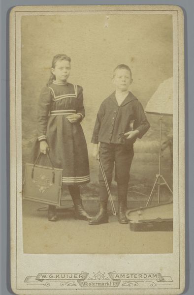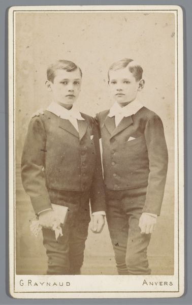 Editor: This is a portrait called "Portret van twee onbekende kinderen uit de familie Marmelstein" by Albert Greiner, dating from around 1861 to 1874. It’s an albumen print, and I find the expressions on their faces so intriguing… almost haunting. What can you tell me about this piece? Curator: Well, it’s more than just a haunting image, it's a complex representation of childhood in a rapidly changing societal landscape. These boys, products of the Marmelstein family, are carefully positioned within the frame. What does their formal attire signify to you? Consider the socio-economic context of the time. Editor: I guess it speaks to their family's status… the ruffled collars and neatly buttoned jackets suggest privilege. Maybe even conformity to societal expectations? Curator: Precisely. And who dictates those expectations? Think about the power dynamics at play during the mid-19th century. This wasn’t simply a family snapshot; it was a carefully constructed performance of identity. These portraits functioned as social currency, reinforcing bourgeois values and projecting an image of respectability. But there's also something subtly defiant in their gaze, isn't there? Editor: I see what you mean. The older boy especially has quite a stare! It almost feels like a challenge to the viewer. So this isn’t just a picture of two kids, it’s a statement? Curator: Exactly. By situating this portrait within its historical and social context, we begin to understand how seemingly simple images are in fact powerful cultural artifacts. It shows how identity, gender, and even class, are being performed, captured and reinforced by photographic practices. It’s crucial to deconstruct these visual narratives, because photographs can reinforce very powerful ideologies. Editor: Wow, I never thought about it that way before! I thought they were just, you know, posing for a photo. Curator: Precisely! Now you're starting to engage with the deeper layers of meaning. Editor: I’ll definitely look at historical photos differently from now on! Thank you.