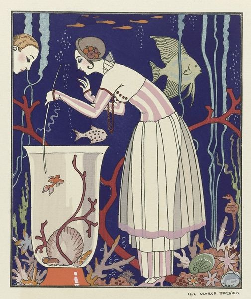 Curator: This artwork, titled "Les Menus and Programmes Illustres," is an example of Alphonse Mucha's distinctive style, made with mixed media. It's stunning. Editor: Yes, the poster format grabs your attention right away. I’m struck by the subtle color palette and the figure’s introspective mood. Curator: The choice of media, most likely ink and paint on paper, played a crucial role in popularizing art. The poster was inexpensive to produce and broadly disseminated. Mucha democratized the experience of art, making it accessible to the burgeoning Parisian consumer class. Editor: Agreed, and structurally, notice how Mucha balances the graphic lettering with the central figure? The way the curved lines echo through the hair, dress, and the decorative elements creates an overall sense of visual harmony. It is a highly structured yet organic design. Curator: The design highlights Mucha’s masterful integration of fine art and applied art. Commercial enterprises thrived by turning the artwork into menus and other daily programs—emphasizing utility. These posters were readily absorbed into everyday life. Editor: Certainly, the central female figure appears deeply immersed in artistic creation. Observe the symbolic circular designs at the periphery; it could signify a continuous cycle of artistic creation. Curator: Right, there's an implied cycle here, too. The publishing house that commissioned Mucha aimed to elevate even everyday transactions through design, adding intrinsic value that consumers appreciated in their routines. It all ties back to material worth. Editor: I find the attention to detail quite engaging, like the tools of the trade—the paintbrush and palette—symbolizing the romantic ideal of the artist, and the pursuit of beauty, truth, and some other value. Curator: Absolutely. In this poster, Mucha’s vision reflects shifts within artistic practice, the production process and access that became the reality of everyday citizens of the turn of the century. Editor: Exactly, these are great details. I enjoyed looking at it again, considering these fresh aspects. Curator: Likewise, another enriching conversation!