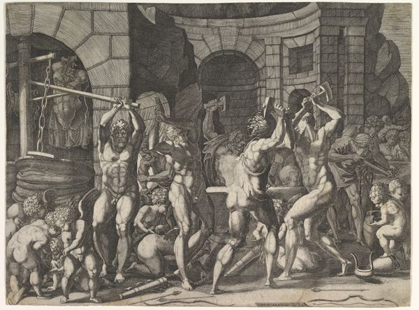 Editor: This is "Ignorance and Mercury," a print made by Andrea Mantegna sometime during the Renaissance. I'm immediately struck by how densely packed the figures are, particularly in the shadowy area, which gives a feeling of being trapped. What do you see in this piece? Curator: For me, it's a powerful statement about the societal role of art and knowledge. Look how Mantegna stages Mercury, the god of reason, pulling people out of this pit, literally rescuing them from ignorance. It reflects the Renaissance humanist ideal of elevating mankind through classical learning. Notice, too, the figure of Virtue partially destroyed – this is very much a statement about the perceived state of society. Editor: That makes sense. So, the chaos in the pit represents ignorance, and Mercury is…education? But who would have seen this image? I mean, was it for the general public? Curator: Precisely. Prints like these had a crucial public function. Consider the development of printmaking as a new media technology in that historical moment; it allowed artists like Mantegna to circulate their ideas, shaping cultural and intellectual discourse amongst learned elites. Editor: It’s like an early form of mass communication. But it's also kind of unsettling to think of knowledge as a tool to 'rescue' people. Does it carry some sense of elitism? Curator: That’s a sharp observation! The engraving absolutely reflects the hierarchies of its time. Whose ignorance are we talking about, and who gets to define ‘virtue’ or ‘reason’? And notice the visual emphasis, it's all directed on Mercury pulling folks out. What message is it sending about free will or socio-political progress? Editor: I never thought about the image having a subtle class structure. I came away with understanding the work having been a symbol of renaissance society being freed from ignorance. Curator: And seeing it today encourages you to inspect such symbols of cultural pride from the Italian Renaissance period, while also challenging to consider whose freedom is valorized, as you mentioned before!
