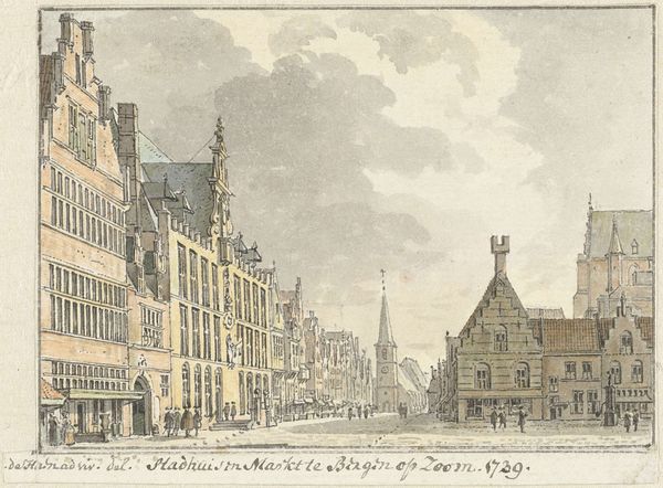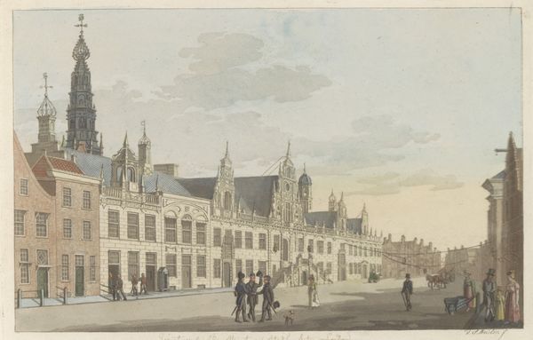 Carel Frederik Bendorp made this print of the fish market and Grote Kerk in The Hague around 1790. This isn't an etching or engraving, it's an aquatint, a printmaking technique that allows for tonal gradations and a wide range of colors, emulating the effects of watercolor. The aquatint process involves the use of acid to create a textured surface on a metal plate, which then holds ink and is transferred to paper. The materiality of the print is evident in its delicate lines and soft, atmospheric effects. In its time, this type of image would have been created through the labor of skilled artisans who translated Bendorp’s original vision into reproducible form. These prints, tied to commerce and consumption, provide valuable social context. They highlight the relationship between art, labor, and the urban experience of The Hague at the end of the 18th century, underscoring how prints like this democratized access to art, making it available to a broader audience beyond traditional elite circles.