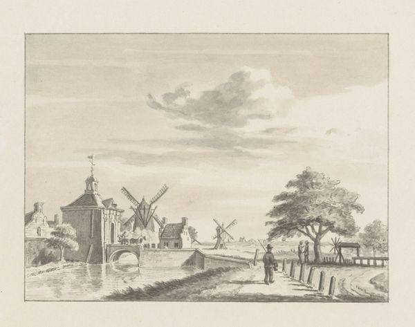 Editor: Here we have an intriguing pencil and graphite drawing on paper, titled "Gezicht op de IJsselpoort in IJsselstein," placing us somewhere in the Dutch landscape between 1750 and 1850, and brought to us by an anonymous artist. It gives me a quiet, contemplative feeling, like stepping back in time. What stands out to you when you look at this work? Curator: The softness, almost a whisper, of the graphite is what grabs me first. The artist wasn't after sharp precision. They seem to be inviting us into a memory, wouldn't you say? Perhaps their own. Notice how the clouds are given as much loving attention as the architecture itself; it's as though the sky is the gate's equal in importance. What does the gate protect? What does the sky conceal? Editor: I hadn't thought of the clouds in that way – almost like a second gate. But looking closer, you're right, the artist really lingered there. Curator: It’s less about showing and more about hinting. It is this that gives it, to me, an open invitation into other meanings, interpretations and, dare I say, whimsies. How fascinating to consider that whoever crafted this image has become forever unseen – yet their vision, this portal into 18th-century IJsselstein, endures. Does it stir your imagination at all, this anonymity? Editor: Definitely! It makes you wonder about the artist’s story. Curator: Exactly! And how the absence of that story colours the way we see their work today. That’s the lovely irony, isn't it? We search for context, but maybe the real magic is in the mystery itself. Editor: So well put – food for thought as I continue exploring art history! Thanks! Curator: The pleasure's all mine! Never forget, dear student, a little mystery is worth a thousand facts.