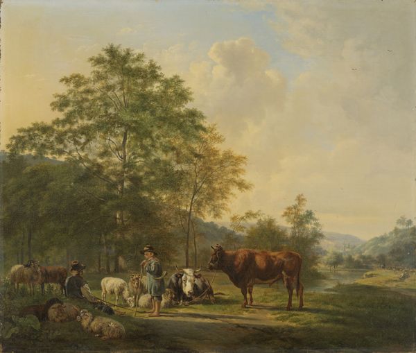 Editor: Here we have "Plundering," an oil painting attributed to Abraham Jansz. Begeyn, dating roughly from 1650 to 1697. The composition feels almost staged, with this idyllic landscape disrupted by figures that seem engaged in… well, something less than idyllic. How do you interpret this work, seeing it through a different lens? Curator: Let’s consider the materiality. Begeyn utilizes oil paint – a relatively accessible medium at the time for professional artists. But look closer. Are those really just farmers or merchants? And what's the social context? Consider the Dutch Golden Age, a period of unprecedented trade and expansion. Isn't it ironic to see these supposed rural laborers mirrored in a Baroque, near realistic painting of landscape, where we ignore that someone is making this and we, today, are consuming this? What labor, what materials were needed, and where does this scene fall within trade and expansion of resources? Editor: I hadn't really considered the implications of oil paint being 'accessible', it felt like it was the only medium at the time. Curator: Accessible, yes, relatively so. However, think about the pigment sources and their production! Where did the pigments come from? How were they processed? Whose labor was involved in producing the materials that ultimately became this picturesque scene? The “plundering” isn't just what's happening in the foreground; it's woven into the entire process of creation. Editor: So you're saying the plundering could be more than what the image explicitly illustrates? The creation and material components are being plundered. It kind of undermines the "realism." Curator: Precisely. It's about revealing the systems of production and consumption embedded in art. This piece, at first glance seemingly straightforward, prompts us to consider the exploitation of labor and resources required for artistic creation. Editor: This gives me so much to think about in terms of today's modern materials that get so easily exploited for a pretty landscape, so thanks! Curator: It’s a powerful reminder that even the most beautiful works can carry the weight of historical and social realities. I think it encourages a critical way to look at all mediums from art to furniture and the spaces around them.