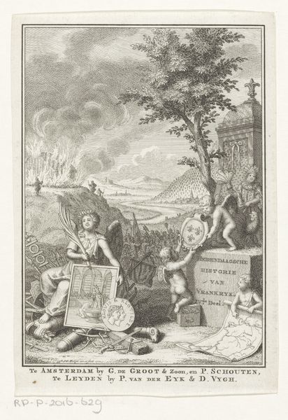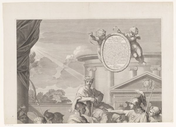 This etching, Allegorie op Ottomaanse Rijk, was crafted by Simon Fokke around 1743. It presents a tightly organized composition, divided horizontally into distinct registers that blend allegory with historical narrative. Below, text is framed by scenes of Ottoman life. Above this, the Sultan stands prominently atop a plinth as the central vertical axis, dividing the landscape into mirroring halves of trees and hills. His posture and the arrangement of figures around him invite a semiotic reading of power and submission, complicated by the map he holds, which hints at territorial ambitions. The sky is activated by an angel carrying a banner, who may represent a call to religious authority. Fokke’s use of line—from the dense hatching of the clouds to the minute detailing of the figures—creates a visual hierarchy that compels us to question the values and systems of representation at play in depictions of empire.