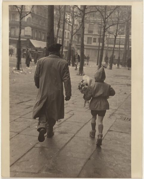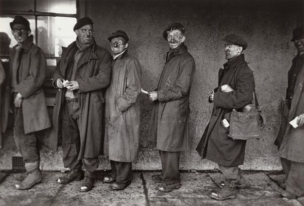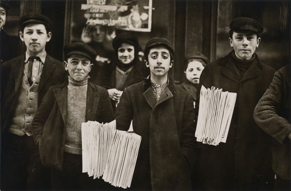 Curator: Helen Levitt’s “New York,” a gelatin silver print from around 1942, captures a group of children on a city street corner. There is a strong sense of play despite the seriousness of the world looming just out of frame. What's your impression? Editor: A rather lovely snapshot of unbridled childhood. There is a gritty undertone, typical for the period and urban setting, yet their sheer joy pushes that austerity to the margins. There's an echo of the social realism movement but softened, seen through a more hopeful lens. Curator: It’s fascinating how Levitt frames these children. Their clothing, while simple and somewhat uniform, speaks volumes about the time—the scarcity, the stoicism demanded by the era. What do you make of their arrangement, this tight huddle of bodies in play? Editor: It makes me think about community. In a time of immense national pressure due to the Second World War, children would have looked to each other to generate fun rather than depending on parental involvement. Their physical closeness acts as a powerful emblem of social ties and of juvenile resilience amid socio-economic stress. Curator: Indeed, that spirit resonates powerfully. This photograph goes beyond just documenting children; it taps into our collective memory of youthful innocence coexisting with complex times. Look closely at the background – the adults, almost spectral and still – are juxtaposed against the vitality of the children’s impromptu gathering. Editor: The visual and conceptual counterpoint between the active children and the passive adult bystanders adds depth. What strikes me is how, through seemingly capturing one frozen moment, Levitt tells an intricate story of 1940s New York: austerity and buoyancy; individual constraint, social joy. She captures what it means to collectively overcome the shadows of everyday struggles by way of communal play. Curator: The city provides the frame, yet their interaction becomes the symbol for sociality itself. Levitt captured that spontaneous unfolding perfectly. It's that beautiful dance between life as we live it, and life as it's lived within us. Editor: Absolutely, an insightful blend of history, emotion, and urban semiotics. I see now a kind of enduring portrait about the city that breathes and adapts in the faces of its children, even in the midst of historical strife.