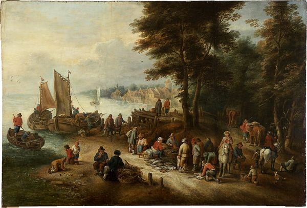 Curator: Well, I’m immediately struck by the light in this oil painting—it gives everything a sense of somber theatricality. Editor: That’s a fascinating observation. You're looking at "Fish Market (Calling the Apostles Peter and Andrew)" painted around 1608 by Jan Brueghel the Elder. What’s so interesting is how Brueghel layers these religious and genre painting themes into one comprehensive critique about 17th century mercantile practices. Curator: Ah, mercantile practices, I agree, what we see is the distribution process of consumable goods and perhaps their global impact as the backdrop provides insight regarding access, class and community engagement? Look how the activity of the harbor interacts with a community gathering for work in distribution or as purchasers? The brushstrokes bring movement and provide attention to material textures, it is alive with interaction and industry! Editor: Exactly! Think about it: Brueghel is taking what’s essentially a Biblical story—the moment Jesus calls Peter and Andrew to become his apostles—and he’s setting it in this bustling, almost chaotic, fish market scene. So we must examine the intersections between economic imperatives and social stratifications present at the time. There’s a real commentary here on religion, social class, the poor, who may be relying on cast offs from trade—the global exchange as it perpetuates itself—all under this one visual plane. Curator: It really begs the question—is it “art” when considering the time it takes for labor intensive work such as this to even dry? How do we then classify these elements of time, technique, skill when we see all the elements converging in a still moment of expression that represents real time? What happens between point A of the process, to when someone deems it art. Fascinating... Editor: Absolutely! It raises critical questions about artistic production and representation. And when we remember Brueghel painted this during a time of enormous social upheaval, particularly around labor and social roles...the painting pushes back to reclaim identities, highlighting complex exchanges across culture that go beyond surface appearances and traditional categorization. Curator: Looking at this piece really reveals how different elements like commerce, and artistry become co-constitutive, shaping our perceptions of history, meaning, and value. Editor: Yes! The artist confronts those ideas with the daily lives of people negotiating religion, market, society... It remains vital and alive even centuries later, because in truth, it reminds us that our present exists with and against the grain of our past.