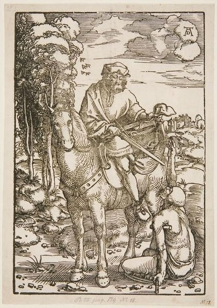 Editor: Here we have Hans Burgkmair’s "Theuerdank on a Boar Hunt." It has an outdoorsy feel. What statements could this piece be making about society? Curator: Considering Burgkmair's historical context, this piece visualizes power. Courtly hunts, like this one, were a means to physically demonstrate authority and control, while also creating political spectacles. Who participates and who observes are key questions here. Editor: So, this isn't just about hunting animals, but about establishing social order? Curator: Precisely. The image operates within a complex framework of political representation. The hunting party's attire, the landscape setting, and the act of the hunt itself communicate status. How do you think the public would have received this imagery? Editor: I guess I hadn't considered the political element of hunting before!