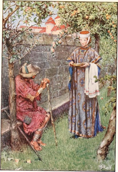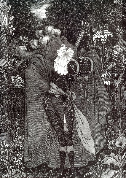 Edmund Dulac created this illustration from Beauty and the Beast, capturing a moment of high drama in the tale. The composition is strikingly divided: the looming, grotesque Beast on the left, and the supplicant figure kneeling on the right. Dulac plays with the scale and spatial relationship between the two figures to enhance the emotional tension. Notice how the rose, the symbolic object, lies discarded between them, its delicate form contrasting with the rough texture of the ground. The subdued color palette, dominated by earthy tones, creates a sense of foreboding. This is punctuated by the bright red slippers and the fallen roses. Dulac uses these visual elements to destabilize traditional notions of beauty and monstrosity. He asks us to consider what these values truly represent. The formal qualities of Dulac's illustration encourage an ongoing, evolving understanding of narrative, symbolism, and representation.