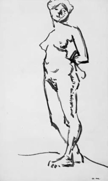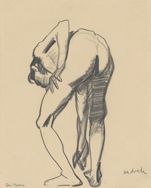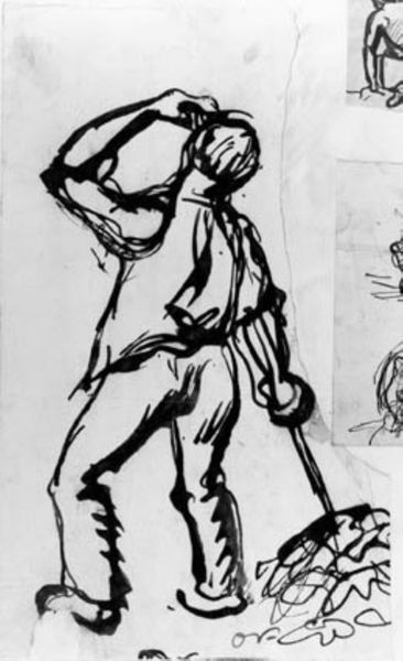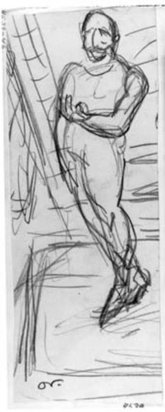 Editor: So, this is Othon Friesz's "Studie af stående, rygvendt mand med en sæk," a pencil drawing from 1907. It's a quick sketch, really, but the musculature is very prominent. What catches your eye when you look at this drawing? Curator: The raw process immediately grabs me. We see the artist's hand at work, the immediacy of the pencil strokes revealing the labor involved. Note how the pencil is used, the varying pressure and direction to define form, especially highlighting the subject’s back and shoulders. What do you think about the material used? Editor: Well, it’s "just" a pencil drawing, seems like quite a simple way to approach figuration...almost academic. But you're right; I see how the very act of drawing emphasizes the physicality of both the subject *and* the artist. The emphasis is on effort, isn't it? Curator: Exactly! The sack, seemingly secondary, actually grounds the figure in a social reality. A simple, mundane object gains prominence here. How does the inclusion of a common item like this, alter the artwork's statement? Editor: It connects the figure to work, to manual labor. It ceases to just be an abstract study of the body and becomes a statement about the worker, his labour, his place in the social fabric. Is this challenging established ideas around the status and symbolism granted to certain subjects or types of work? Curator: Precisely. It compels us to re-evaluate our notions of skill, craft, and the traditional boundaries between 'high art' and the everyday realities of labor. What kind of relationship do you think it fosters with the viewer? Editor: The materiality of the piece really shifts how I understood the purpose of the drawing - what appeared like a 'simple sketch' now has social meaning. Thanks! Curator: Agreed! Seeing the drawing through the lens of material conditions truly illuminates its richness.