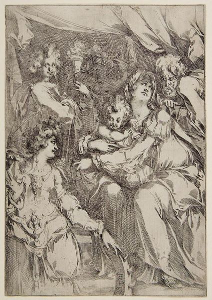Jacques Bellange created this print, “The Holy Family with Saint Catherine, Saint John the Evangelist and an Angel,” around the turn of the 17th century. Bellange lived during a time of religious and political upheaval in Europe, which shaped his artistic vision. Here, the traditional Christian scene is reimagined through the lens of Mannerism, an aesthetic that favored elongated figures, stylized poses, and complex compositions. What does it mean to see a sacred image infused with such theatricality? Note the figures of Saint Catherine and Saint John, who were often symbols of learning and devotion. Their inclusion suggests a dialogue between faith and intellectual inquiry, reflecting the complex relationship between religious belief and Renaissance humanism. Bellange's etching invites us to contemplate the intersection of faith, identity, and artistic expression. It challenges us to consider how artists navigate their cultural contexts, and how personal experiences influence representations of religious narratives.