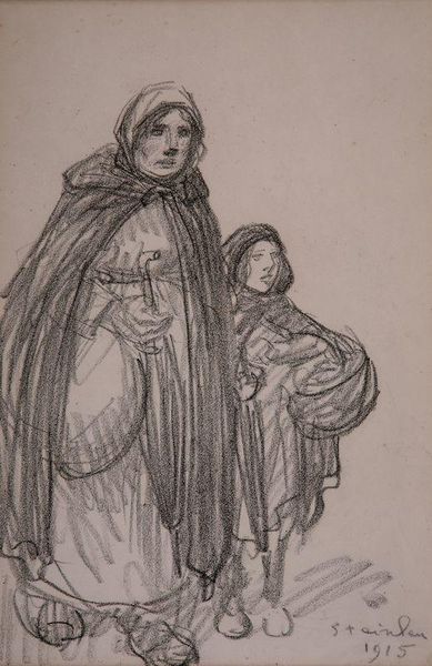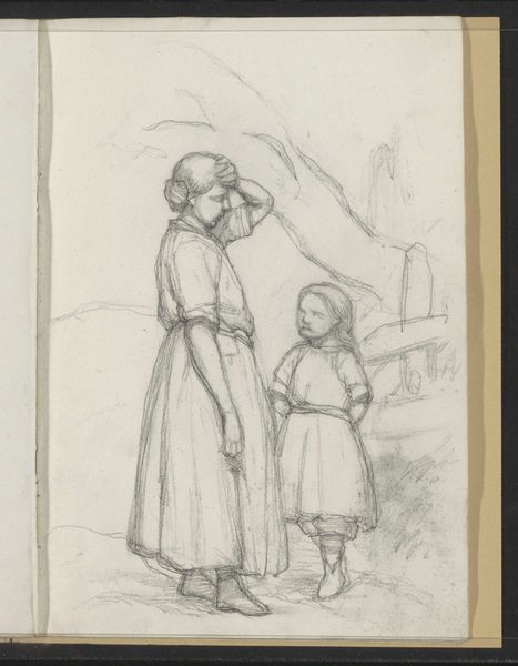 Curator: Looking at this sketch, there's a quiet intimacy conveyed, isn't there? Editor: Definitely. There's a tentative feel to the lines themselves, like the artist is figuring something out. But, as a first impression, it looks incredibly bleak. Barely any detail beyond the figures themselves. Curator: The work, dating from 1811 to 1867, is titled "Vrouw met een kind aan de hand"—"Woman with a child by the hand"—by Christiaan Wilhelmus Moorrees. There's something very archetypal about the imagery of the mother and child holding hands, traversing... well, it’s an empty space in the image. Editor: It's mostly ink on paper, right? Probably a fairly cheap, accessible means for the artist to quickly explore this imagery. Curator: Indeed. We often imbue the maternal image with all sorts of symbolic weight: protection, nurture, continuity. It makes me consider how those ideals may have changed—or not—in the almost two centuries since it was created. Does that visual vocabulary, the link to cultural memory, remain potent? Editor: I am less convinced. Looking at the line weight and style, it almost feels like this drawing may be one of the pages from the sketchbook. I’d wager this wasn't even necessarily made for "display," but perhaps was exploratory and personal. And even the details—the clothing—signal something beyond those idealized roles. Those are clearly garments of labor, and practical, modest, rather than idealized forms. Curator: It challenges our urge to sentimentalize, perhaps. I agree that the texture invites the idea that this piece originated as part of some broader visual research within a sketchbook, and not as a finished, displayable piece. I hadn’t initially picked up on that. Editor: To be fair, there's something incredibly striking and immediate about seeing labor represented in simple sketches like these. Curator: It certainly focuses one’s attention away from simply "maternal symbolism," towards broader realities, and opens a much wider interpretive space, doesn't it? Thank you for your insights on this. Editor: Of course. Seeing how materiality shapes how we receive even the simplest drawing never fails to provide interesting alternative perspectives on any given art.