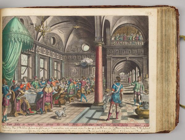 Curator: This image, currently housed in the Harvard Art Museums, depicts "King Nebukadnessar Receives Daniel" by Joannes van Doetecum. It's quite striking, wouldn’t you agree? Editor: Indeed! The composition seems so carefully arranged, almost theatrical. The color palette, while somewhat faded, still conveys a sense of grandiosity, especially in the architectural details. Curator: Absolutely. And consider the means of production here. This is a print, likely made using etching techniques, reflecting the artistic labor and the material processes of its time. How do you think this process influences its reception? Editor: The linear precision achieved through the etching process reinforces the formality of the scene. The figures, while small, are rendered with an impressive level of detail, inviting close inspection. Curator: Yes, the craftsmanship allowed for wider distribution, making biblical narratives accessible to more people. The material and the process democratized access to religious iconography, shifting away from singular devotional objects. Editor: I agree. Though the formal language is still clearly that of the court, suggesting a certain level of privilege or access even within this distributed context. What a fascinating interplay. Curator: Precisely. It leaves me pondering the reach of artistry. Editor: And the enduring power of considered design!