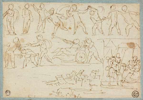 Editor: So, here we have "The Cruelties of Tiberius," a drawing in ink by Paul Egell, from around 1748. It definitely has a disturbing quality; all the figures seem caught in moments of suffering. How do you interpret this work? Curator: The visceral impact is certainly intended. It's a tableau of power, and power's abuse. Notice how the symbols cluster: the hanging figures, the overturned tables, the dominating presence of what must be Tiberius. The artist is building an emotional charge, connecting with the cultural memory of tyranny and the vulnerability of the body. How do these images resonate with our understanding of leadership, then and now? Editor: I hadn’t considered the symbols as cues for collective memory. So, it's not just a literal depiction of events, but a statement about power? Curator: Exactly. Consider the placement of Tiberius. He's physically elevated, almost detached, while the chaos unfolds. It speaks volumes about the separation between ruler and the ruled. Where do we see that distance reflected today, in our visual culture? Think about propaganda or the ways leaders are presented in media. Editor: I see what you mean! The idea of that distance – it's not just about historical events. The way those images circulate in our minds continues to shape our understanding of power. It's pretty intense, actually. Thanks for this enlightening observation. Curator: My pleasure. The work becomes a mirror reflecting our own relationship with these timeless themes of dominance and submission. It invites us to question the iconography that shapes our world.