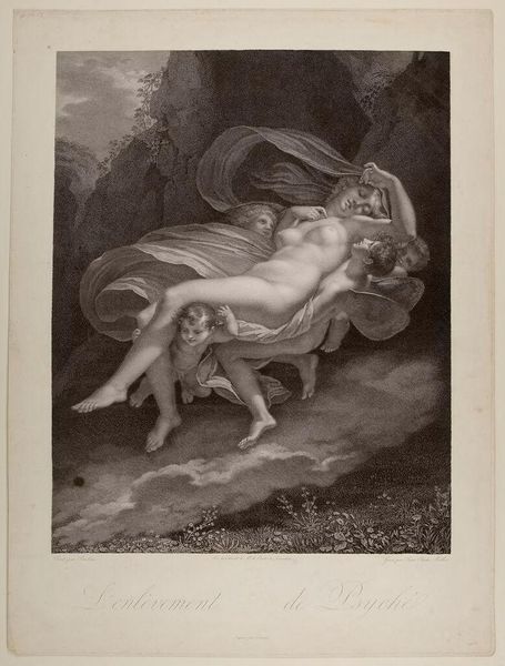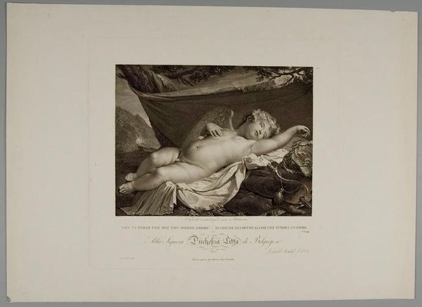 Curator: Here we have "Cupid Sleeping Under a Tent" by Mauro Gandolfi, born in 1764. It presents as quite a peaceful scene. Editor: It’s interesting how Gandolfi depicts Cupid, usually a symbol of passionate love, in such a vulnerable, almost industrial state of repose. Curator: The tent itself becomes a kind of factory tent, housing the materials of love - arrows, perhaps a quiver, all laid out. It's about the construction of the concept of love. Editor: The image recalls older ideas about Cupid as dangerous and unpredictable. The closed eyes and vulnerable body suggest the potential for misdirected desires. Curator: The artist seems very concerned with the manufacturing of emotion, love as a produced commodity. Editor: I agree, but I still sense the underlying power of Cupid as an untamed force, even in sleep. Curator: It seems that Gandolfi is more interested in the societal framework that creates these symbols. Editor: Whether as a symbol of production or cultural danger, the artwork still creates an image of the powerful symbolism of cupid.