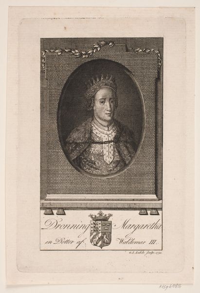This is a portrait of Queen Margaretha, made by Gerhard Ludvig Lahde, using engraving. The image, dominated by monochrome lines, presents us with a highly structured composition. Lahde employs hatching and cross-hatching to define form, giving depth to the Queen's features and attire. Notice how the oval frame containing the Queen is itself framed by rectangular patterns, creating a sense of enclosure. The precise lines and formal arrangement suggest an intent to convey authority and stateliness. Engraving, as a medium, inherently deals with reproducing images and disseminating information. The detailed rendering of Queen Margaretha serves not merely as a likeness, but as a structured representation of power. Consider the ways in which Lahde’s choices, from line to composition, shape our reading of the subject, embedding cultural meanings within the artwork’s formal qualities.