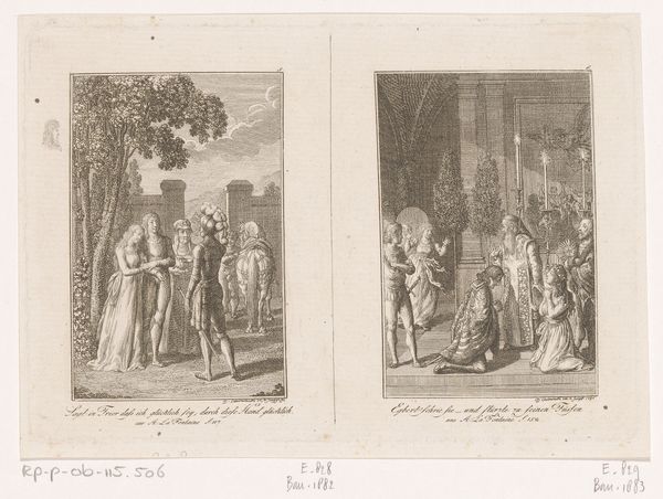 Curator: Daniel Nikolaus Chodowiecki created this engraving, aptly titled "Drie heren in de dierentuin opzoek naar een bruid", or "Three Gentlemen at the Zoo Seeking a Bride", in 1784. Editor: My initial impression is one of lightheartedness and intricate detail. The Rococo style lends a certain flirtatious air to the scene, doesn't it? The meticulous lines in the engraving really bring out the textures of the fabrics and the expressions on their faces. Curator: Indeed. The print offers a satirical snapshot of societal rituals surrounding courtship and marriage. The zoo, or menagerie, functions as a stage. Observe how the gestures and poses of the men mimic a performative display—the search for a 'bride' likened to observing animals on display. Editor: The composition strikes me as very deliberately divided. There’s a strong contrast between the outdoor setting of the men, filled with open sky, and the confined interior space with the two women, setting up opposing values. Curator: The interior could well be mirroring societal confines expected of women. It certainly emphasizes the very different roles prescribed to each gender. Think of the heavy costumes of the elite; their symbolic burdens shape how the figures exist in this narrative. Consider, too, the animalistic metaphors ingrained in the rituals of seeking a spouse. Editor: I see that play in the positioning of the women, slightly off to the side, presented as objects of scrutiny. From a formal perspective, the figures are placed so precisely that it highlights that performative element, underlining their conscious display. Curator: Absolutely, and the symbolism inherent to Rococo is often infused with societal critique beneath all the powdered wigs and extravagance. Chodowiecki keenly comments on social theater and arranged unions. Editor: The visual structure really mirrors and emphasizes the staged social rituals that you mentioned. It all serves as an apt method of encapsulating its themes. Curator: It does leave us reflecting on how much these rituals of courtship have changed—or haven't—over the centuries. Editor: Precisely. I can’t help but think of the inherent tensions—surface appearances, restrictions, hidden societal judgements— captured within its delicate lines.