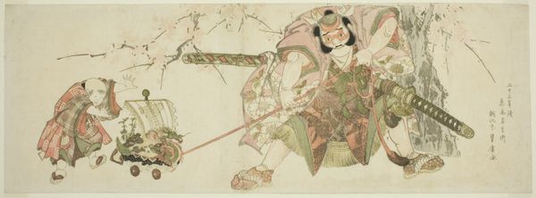 Curator: What a fascinating woodblock print! Utagawa Toyohiro's "Asahina Trying to Separate Rice Cakes" really grabs your attention, doesn't it? Editor: It does! The sheer physicality of the figure, Asahina, struggling with those cakes is quite striking. What do you see in this piece beyond the immediate action? Curator: Well, it’s interesting to consider this image in the context of Japanese societal expectations of strength and masculinity. Does the print reinforce or subvert these ideals through Asahina's exaggerated effort? Editor: That's a great point. I hadn't considered how the artist might be playing with those themes. Curator: Exactly! And how might the rice cakes themselves symbolize abundance or even the burdens of responsibility within that society? These visual cues invite us to explore deeper cultural meanings. Editor: I see what you mean. It's more than just a funny image; it's a commentary. Thanks for shedding light on that! Curator: Absolutely! Art is always in conversation with its context.
