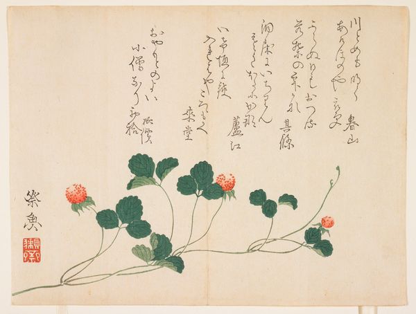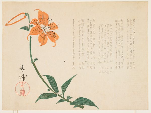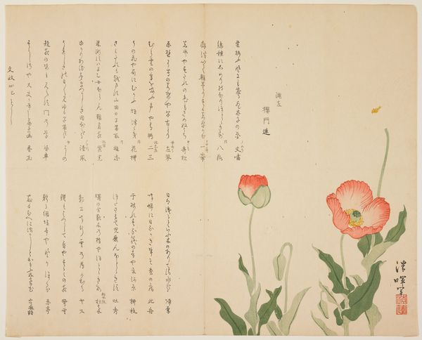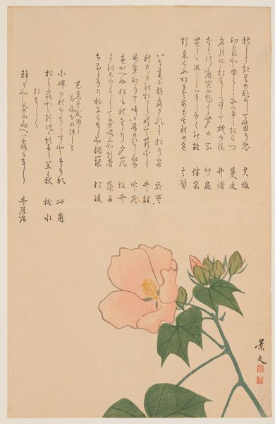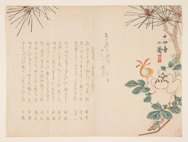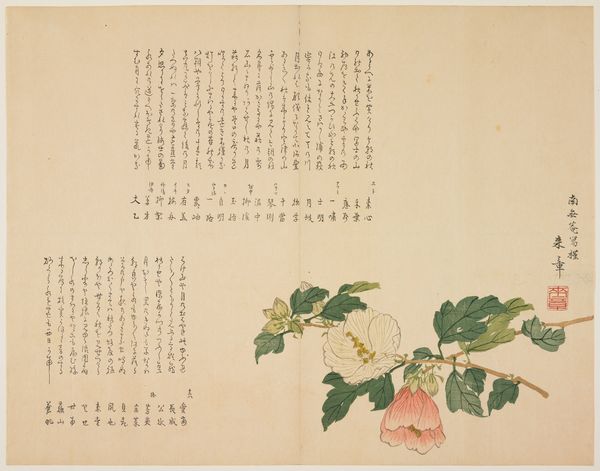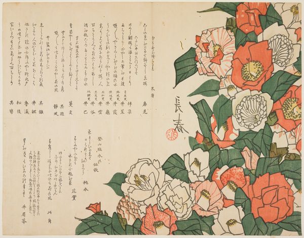 This is a print called ‘Camellia’ by the artist Hyakujō. Though undated, its visual style places it within a rich history of Japanese printmaking. The image presents a cluster of camellia flowers alongside columns of elegant calligraphy. The camellia in Japanese culture is more than just a pretty bloom. Its symbolism is complex, tied to both beauty and a sense of transience, given that the flower tends to drop from the plant in one piece when it dies. The calligraphy reinforces this complexity. In Japan, calligraphy isn't merely writing; it's an art form in itself. The style of writing, the ink's texture, and the layout on the page all contribute to the poem's meaning. The way these elements come together suggests an artist deeply engaged with his cultural traditions. To fully understand ‘Camellia,’ it’s worth exploring the social and cultural context of Japanese art, researching the symbolism of flowers, and delving into the history of calligraphy. With these kinds of resources we can start to unpack the significance of art that is deeply embedded in cultural traditions.