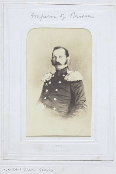 Curator: Alright, let’s chat about this "Portret van een man met snor in uniform," a photograph dating back to somewhere between 1860 and 1894, credited to Ghémar Frères. Editor: Right! And it feels very… formal, I suppose. He looks like a man of presence with that commanding gaze and ornate mustache. What stands out to you when you look at this work? Curator: It's all in the mustache, isn't it? A perfectly sculpted handlebar. He wants you to *see* it! Think about this: photography in that era was an expensive, laborious process. To sit for a portrait wasn't a casual affair. It spoke to a desire for legacy, for permanence, or even simple familial love and remembrance. But the lack of ease also strikes me – do you get that feeling, the constraint of posing? Editor: Yes, it's definitely there! It makes you wonder about the man behind the uniform. Do you see any clues about his personality in the image? Curator: Oh, plenty! Look at the slight tension around his mouth, maybe a touch of impatience, but also, definitely a dash of pride. The Ghémar brothers have really captured that duality in a single frame. What do you think it tells us about photography at this moment? Editor: That’s interesting. I guess it tells me photography was so much more intentional and reveals something more because of the intentionality and technology available at that time. It wasn’t an impulsive snap. Curator: Exactly! Each photograph from that era feels like a time capsule. We can only extrapolate so much from an image, of course, but hopefully enough to encourage future observers to reflect on history's intricacies. Editor: I see what you mean. Now, I can imagine stories surrounding him just by observing his posture and dress. Thanks, that was enlightening!