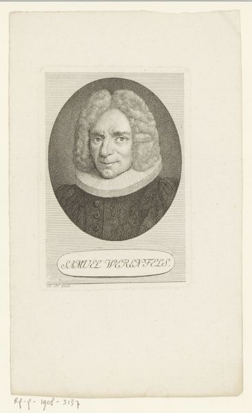 Heinrich Pfenninger created this portrait of Jacob Bernoulli using etching. The composition is immediately striking: an oval portrait set against a backdrop of vertical lines, creating a stark contrast between the curved and the straight. This interplay of forms draws the eye, compelling us to consider how such visual structures shape meaning. Bernoulli's visage, framed by the oval, is rendered with meticulous detail. The texture of his wig, the fabric of his garments—all are captured with a precision that speaks to the engraver's skill. These aren’t merely representational choices; they are integral to the symbolic language of portraiture. The vertical lines behind him serve to highlight the subject, an embodiment of order and reason. The very act of framing—placing Bernoulli within an oval—serves to elevate and isolate him. It transforms the individual into an emblem, an object of contemplation. This piece invites us to consider how visual forms, when decoded, reveal layers of historical and cultural meaning.