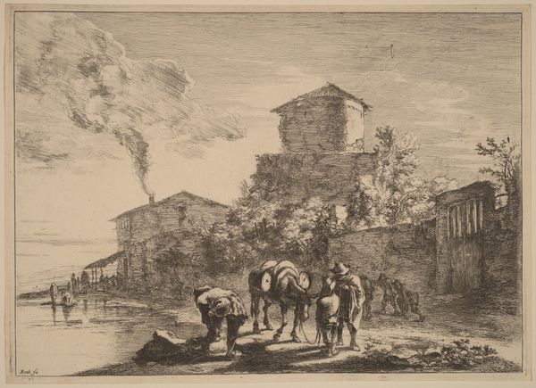 Curator: Here we have "Group of houses in Tivoli," a drawing made around 1625 by Bartholomeus Breenbergh. He used brown ink to render the architectural structures nestled in the Italian countryside, now part of the Städel Museum collection. Editor: It evokes a strong sense of pastoral tranquility, yet with this wispy plume of smoke rising into the sky it also conveys such palpable feelings of the domestic, the every day. Curator: Breenbergh was one of the key figures who brought the Italianate landscape tradition back to the Netherlands. You can see here the clear influence of classical architecture, not just in the buildings themselves, but in the way they're presented as part of this harmonious, almost idealized view. This sort of rendering created new appetites for art among burgeoning Dutch mercantile classes. Editor: It's fascinating how he's used the ink to differentiate texture—the rough, crumbling stone of some structures versus the smoother surfaces. The artist almost imbues a spirit, if not directly than as allegory, with human stories rooted to them. What meanings can we extract from these details, I wonder. Curator: Well, consider the symbolic importance of ruins during the 17th century, not just reminders of past glory, but also reflections on time, decay, and the transience of human achievement. Landscape drawings became hugely fashionable status symbols during that period, a taste driven by expanding markets and changing social expectations regarding travel and learning, as much as by genuine appreciation of nature or even of 'ruins.' Editor: And this smoke we were talking about; it contrasts nicely against the stolid masonry, a symbol, maybe, of human activity that rises above even architecture; but also perhaps the fragility of this human endeavor. It connects the sky to home and back again. Curator: Perhaps Breenbergh also included it to give it a more timeless appeal, something beyond his immediate cultural milieu and toward this very day. Editor: Precisely. Art, then as now, capturing these stories and memories. It’s beautiful to think that something like this small ink drawing encapsulates so much.