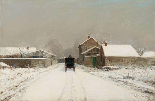 Editor: We’re looking at Fritz Syberg’s "Snow-Covered Highroad in the Sunshine," painted in 1895 using oil on canvas. The scene is simple – a snow-laden road leading into the distance. It’s quiet, almost dreamlike in its pale palette. How do you read its formal qualities? Curator: The reduction of color contributes significantly to the overall impact. Observe how Syberg masterfully employs varying shades of white, grey and blue to depict the snow’s texture and the light’s reflection. The composition relies on the road’s recession to create depth, leading the eye through a series of carefully placed visual anchors, namely the bare trees and the muted suggestion of houses. Note the surface's almost granular texture. What could that materiality imply about Syberg’s methodology? Editor: It looks like the paint was applied very thickly in places. Perhaps he worked quickly, capturing a fleeting moment? Curator: Indeed. The impasto technique enhances the sense of immediacy and direct observation, core to plein-air painting. This aligns perfectly with Impressionistic principles where the focus is capturing the ephemeral qualities of light and atmosphere, prioritizing sensation over meticulous detail. Do you notice how the brushstrokes, while distinct, blend seamlessly to evoke the soft, diffused quality of a winter’s day? Editor: Yes, the softness really emphasizes the tranquility of the scene. I appreciate how analyzing these techniques clarifies the overall impact. Curator: Exactly. By examining these formal aspects—texture, composition, and color—we move closer to understanding Syberg's aesthetic intentions. He has orchestrated the elements of his craft with acute awareness.